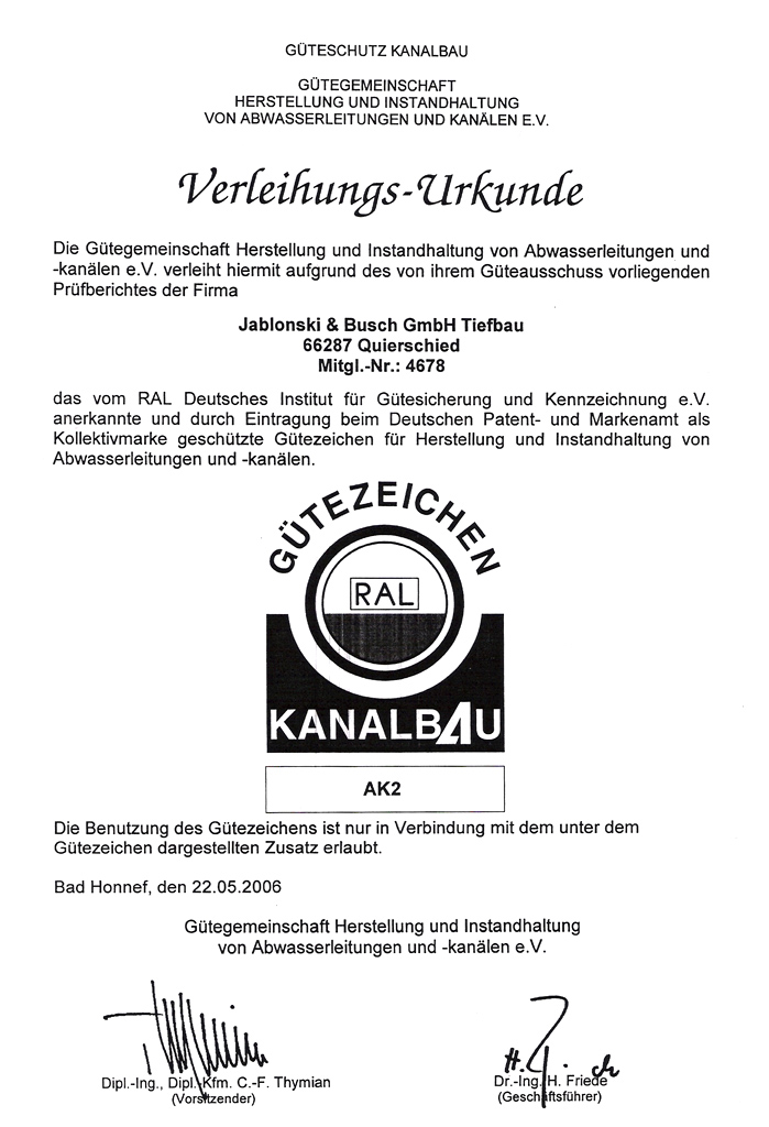 Entwicklung Zu Beginn der Tätigkeit befasste sich das Unternehmen überwiegend mit Straßenbauarbeiten als Jahresvertragspartner der Landeshauptstadt Saarbrücken. Es folgten in den 80iger Jahren die Erweiterung um Tiefbau und Kabelverlegung (Fernseh- und Telefonkabel) für die Deutsche Telekom. Der nächste Schritt folgte in den 90igern mit den Bereichen Energiekabelverlegung, Gas- und Wasserrohrverlegung. Bis heute sind ab dem Jahr 2000 Kanalarbeiten, zuerst jedoch lediglich Hausanschlusskanäle, danach mehr und mehr Neubauten von Hauptkanälen und Schachtbauten hinzugekommen. Es folgte in 2006 die Zertifizierung durch die Gütegemeinschaft Kanalbau – AK 2 (Kanalbau in offener Bauweise) |